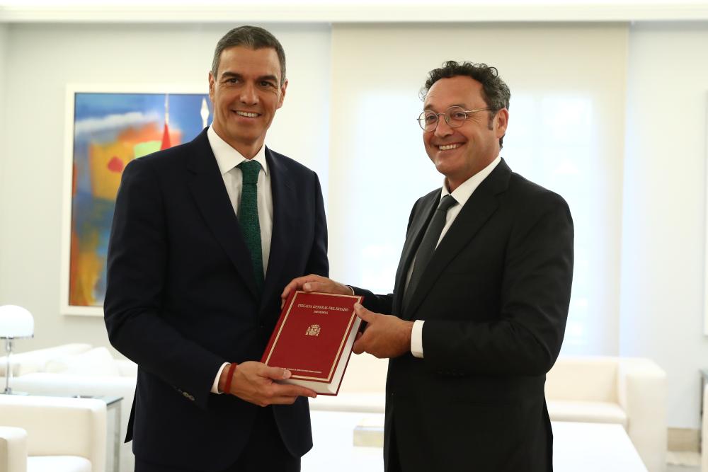 A continuación, el Fiscal General del Estado ha entregado un ejemplar de la Memoria Anual de la Fiscalía al Presidente del Gobierno, Pedro Sánchez. En un encuentro en el Palacio de la Moncloa, García Ortiz ha expuesto al jefe del Ejecutivo los datos más relevantes del documento que recopila la actividad de las Fiscalías territoriales, las Fiscalías especiales y las Áreas especializadas.