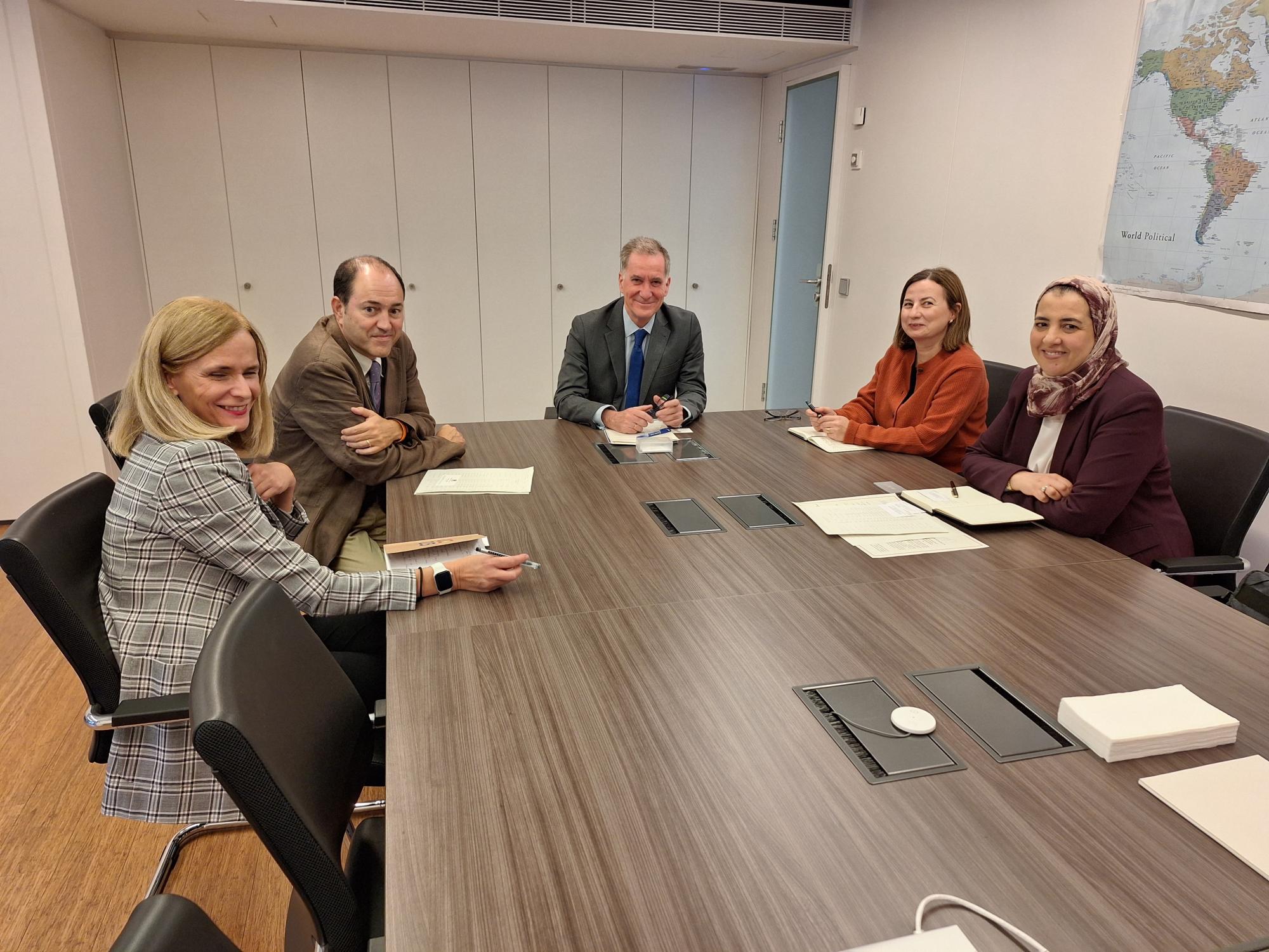 Francisco Jiménez-Villarejo, Fiscal Coordinador de la Unidad de Cooperación Penal Internacional, ha recibido a Nadia El Youssefi, nueva magistrada de enlace de Marruecos en España, en un encuentro al que han asistido los fiscales Marta Holgado, Elena Agüero y José Miguel Company.