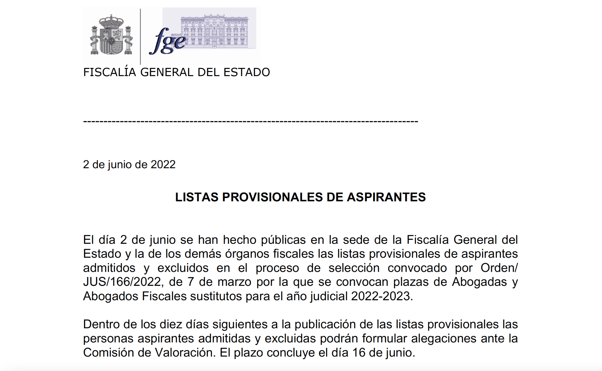 El día 2 de junio se han hecho públicas en la sede de la Fiscalía General del Estado y la de los demás órganos fiscales las listas provisionales de aspirantes admitidos y excluidos en el proceso de selección convocado por Orden/ JUS/166/2022, de 7 de marzo por la que se convocan plazas de Abogadas y Abogados Fiscales sustitutos para el año judicial 2022-2023.