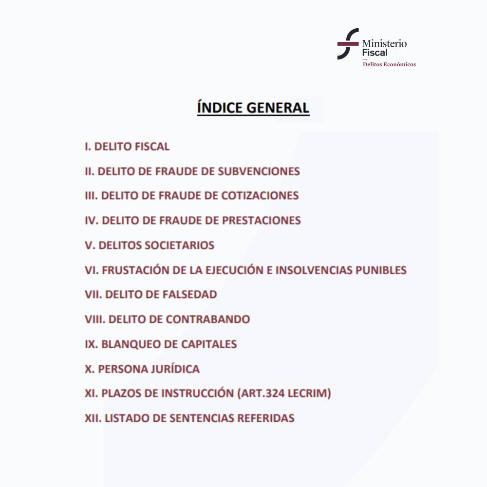 Para esta publicación se ha elaborado una clasificación por delitos partiendo del delito fiscal como principal razón de ser de la especialidad. Junto a él, se han incluido los delitos de fraude de subvenciones, de cotizaciones y de prestaciones, delitos societarios, frustración de la ejecución e insolvencias punibles, falsedades, blanqueo de capitales y contrabando.