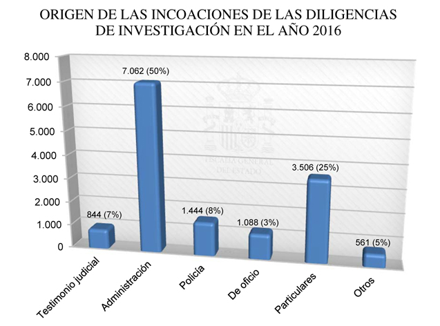Fueron principalmente los órganos de la Administración los que pusieron en conocimiento del Ministerio Fiscal hechos que estimaron que pudieran ser constitutivos de delito, siendo la segunda vía la denuncia de particulares. La actuación de oficio se ha incrementado notablemente respecto del año anterior. Así, frente a las 519 diligencias de investigación incoadas de oficio en el año 2015, en el año 2016 fueron 1088.