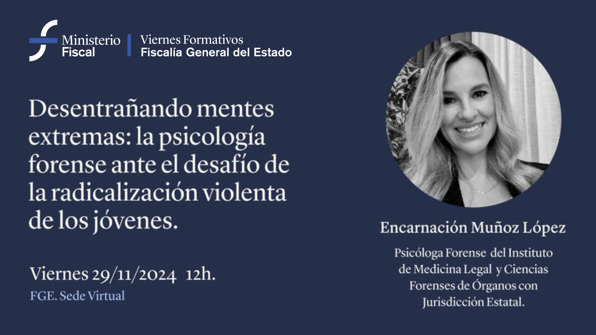 Encarnación Muñoz López, psicóloga del Instituto de Medicina Legal y Ciencias Forenses de Órganos con Jurisdicción Estatal, ha protagonizado hoy el webinario titulado “Desentrañando mentes extremas: la psicología forense ante el desafío de la radicalización violenta de los jóvenes”, en el espacio de reflexión de los ‘Viernes Formativos de la Fiscalía General del Estado’.